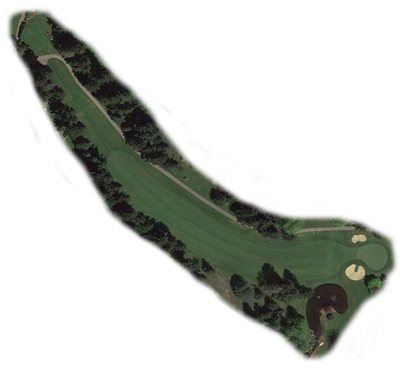 Nice downhill sharp dogleg left that puts a premium on a well placed shot. Good back to front sloping green with bunkers on both sides and a pond to the right.